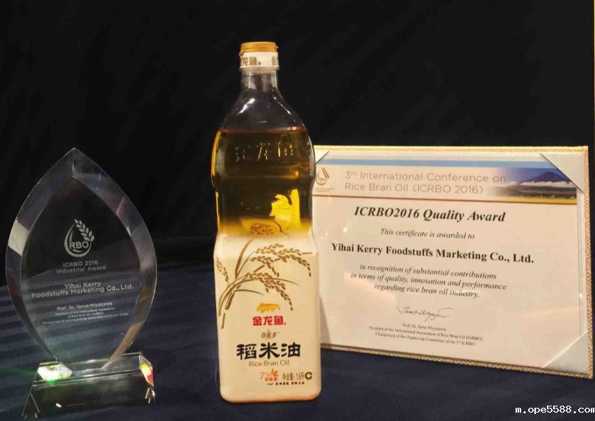 在第三届国际稻米油会议上,金龙鱼稻米油荣获ICRBO-国际稻米油理事会评选的“国际品质大奖“